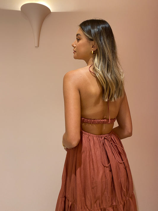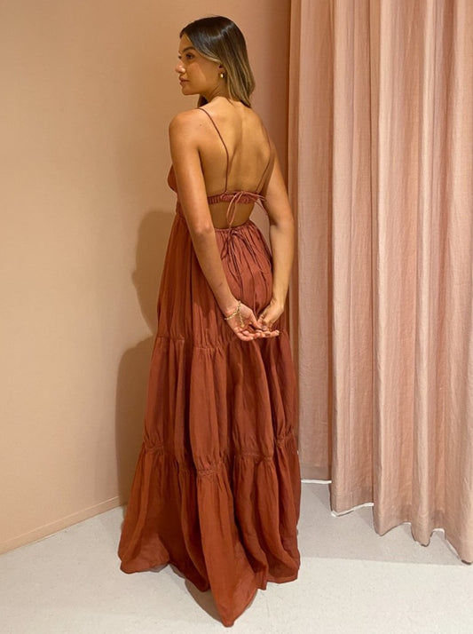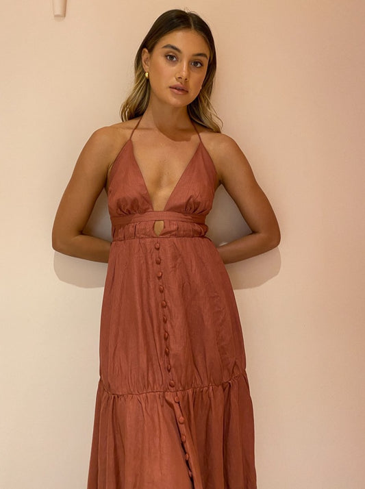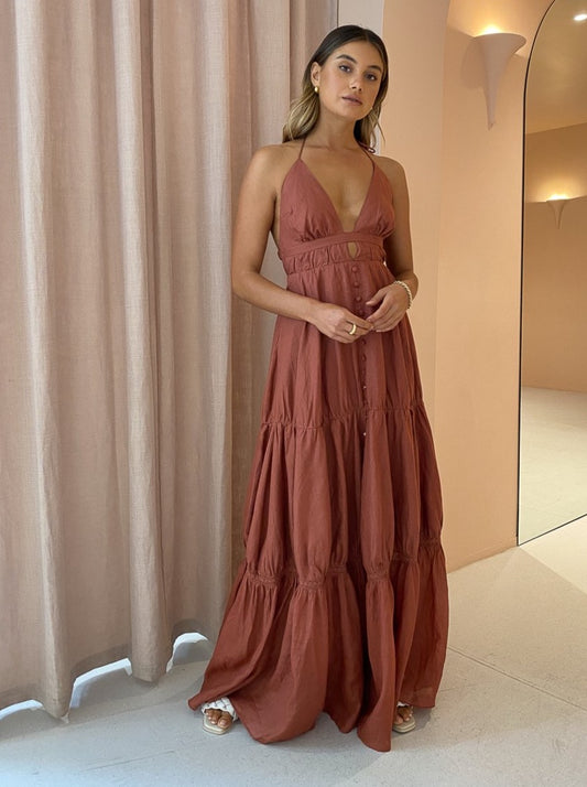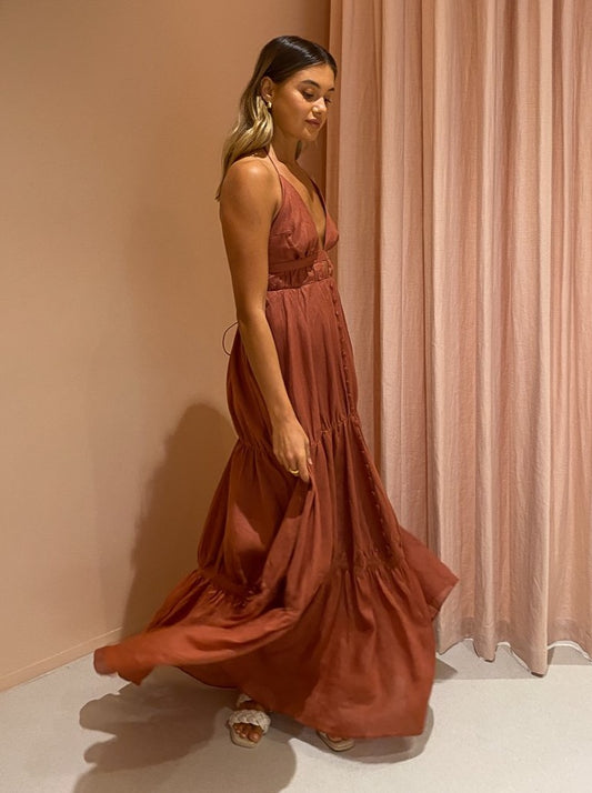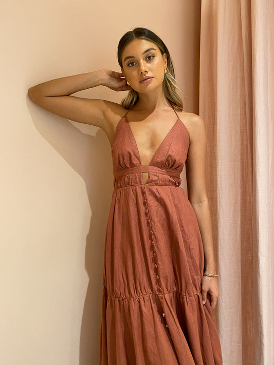 The Liana Linen Ramie Maxi Dress in Terracotta has us falling in love with this new wardrobe addition from Joslin.