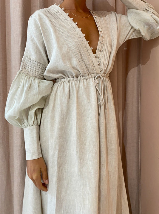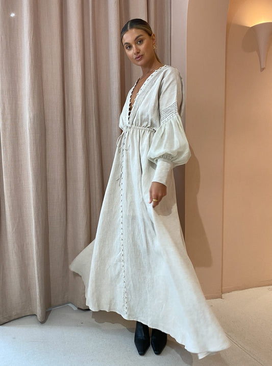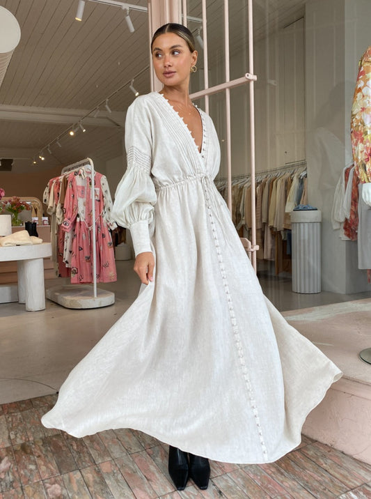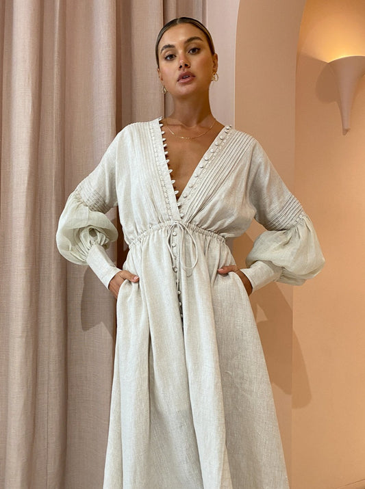 Delicately crafted from a 100% linen fabrication, this dreamy maxi dress is designed to be worn with ease, featuring a deep v neckline with self covered buttons softly fitted through the bodice which falls elegantly into a full gathered skirt.