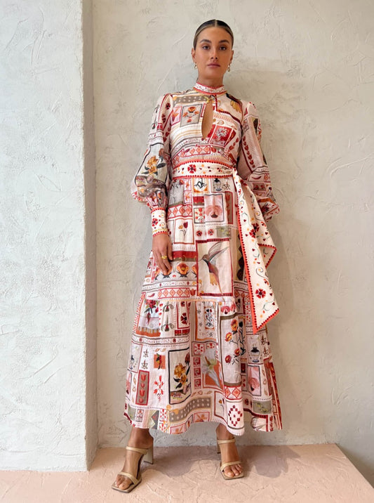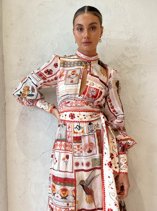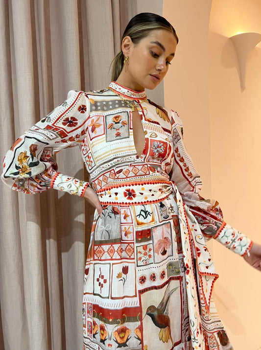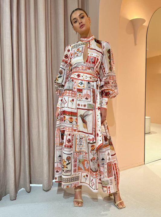 Delicately crafted from a lightweight ramie, this maxi celebrates the ancient Mayan culture through the thoughtfully printed myriad of symbols, bird life and flowers. Sitting relaxed throughout the bodice and fitted at the waist, it features long blouson sleeves with fitted cuffs and a high yoke before falling into a tiered pleated skirt.