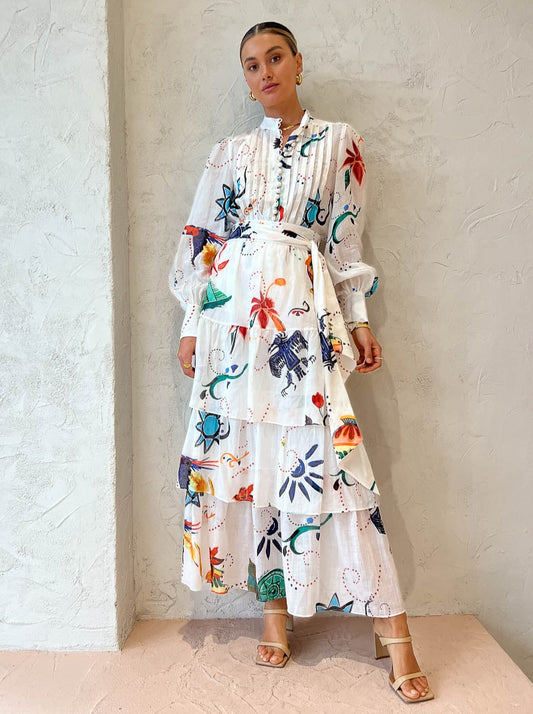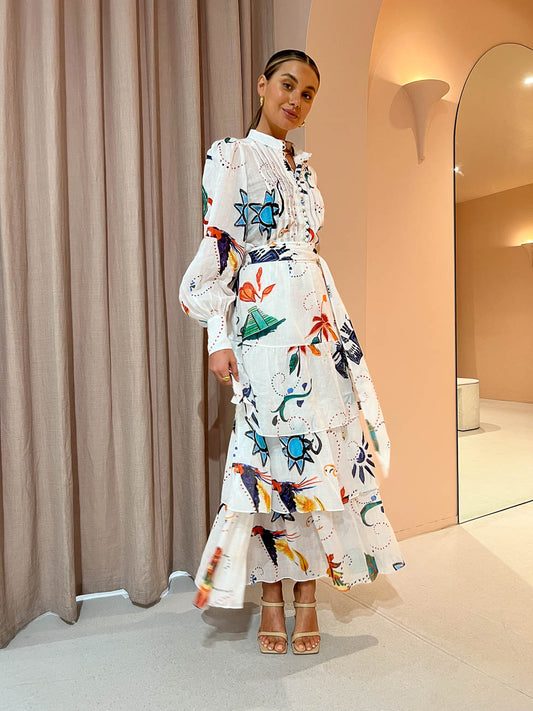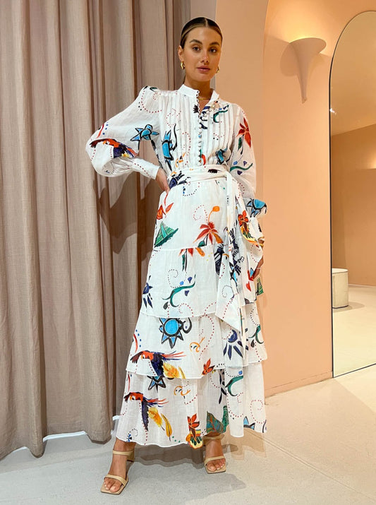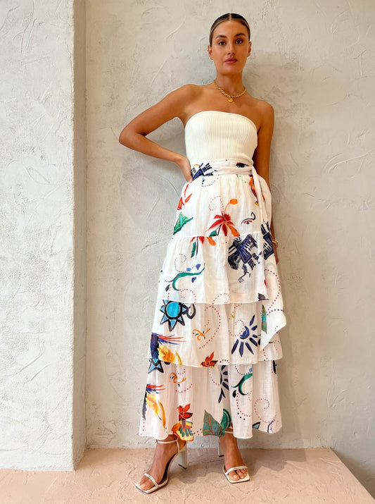 Kate Ford's Cordia Tiered Skirt in Santiago Ivory is a revisited statement piece with a timeless printed touch.