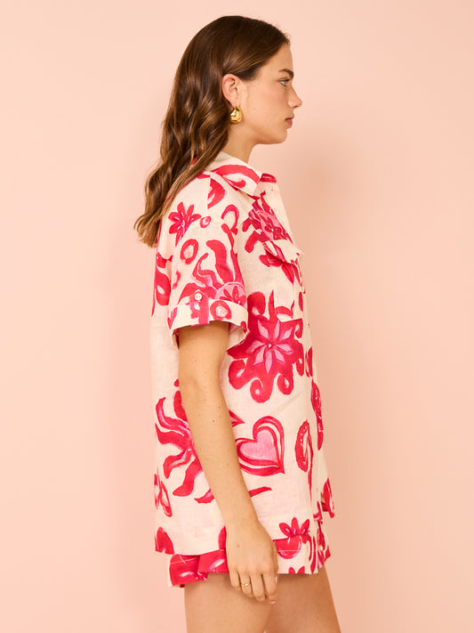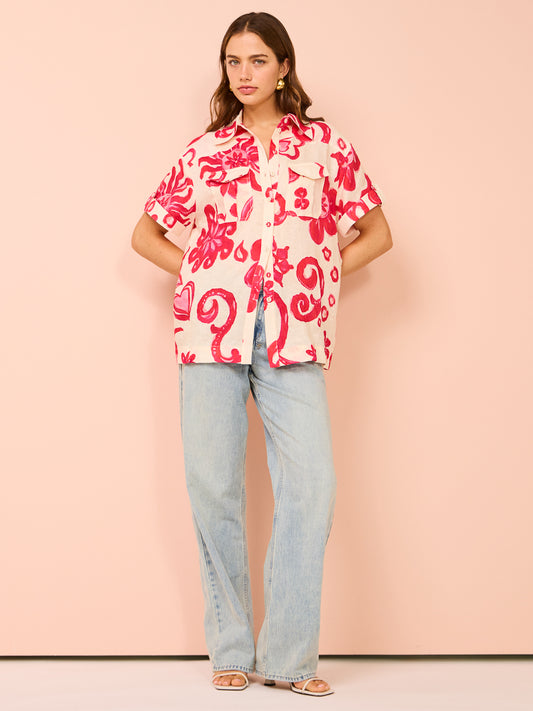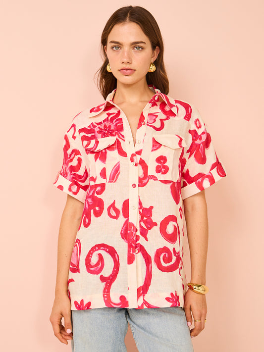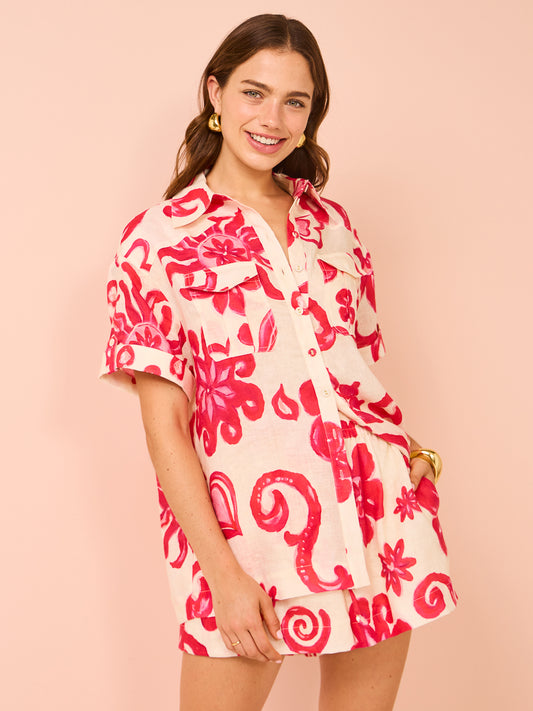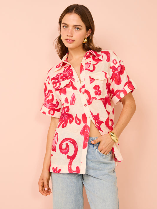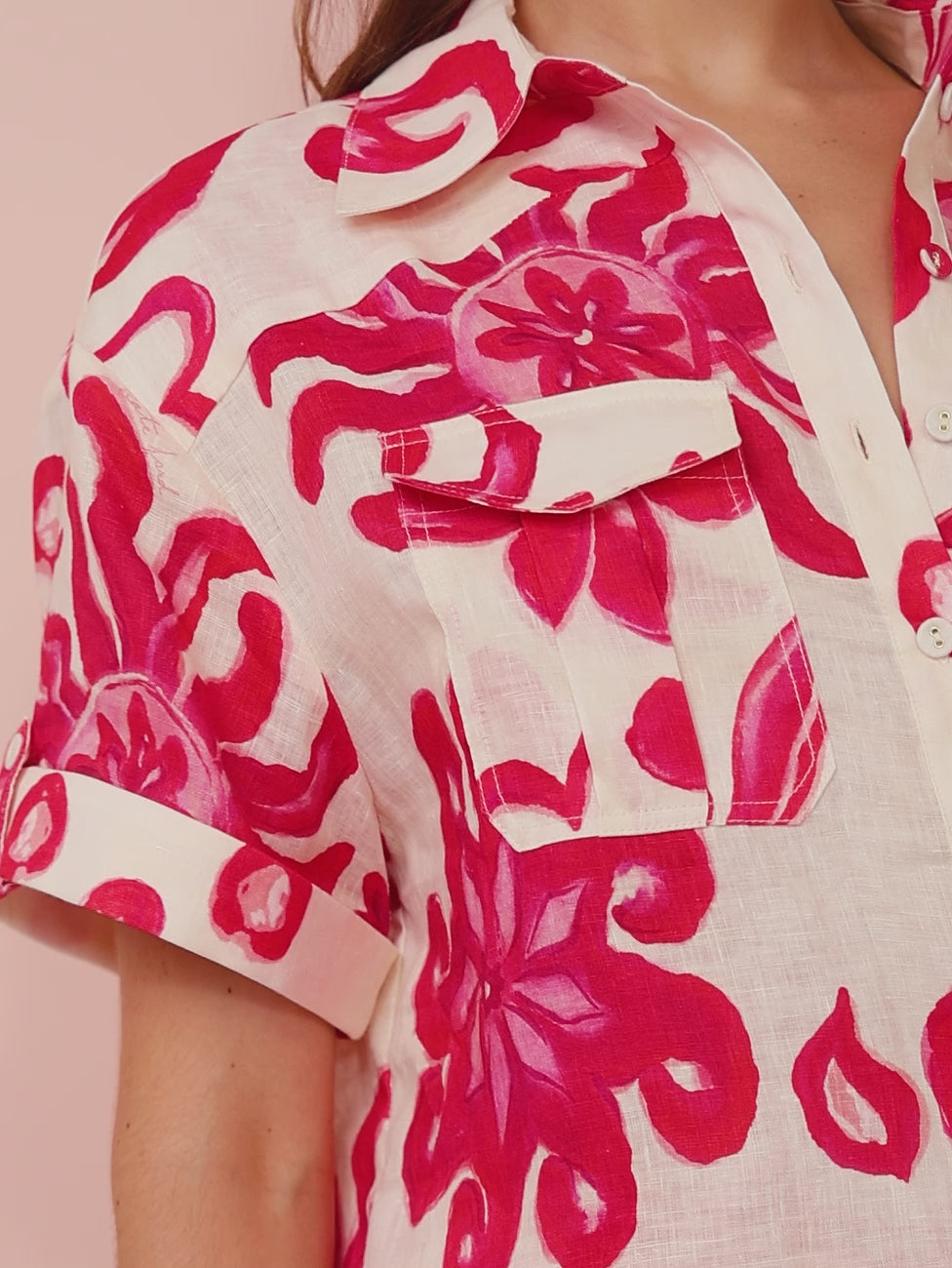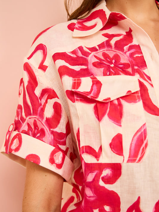 Crafted from a lightweight linen fabrication, this oversized tee features a signature exclusive print, self-covered eyelet buttons, patch pockets, and a collared neckline for a timelessly sophisticated look.