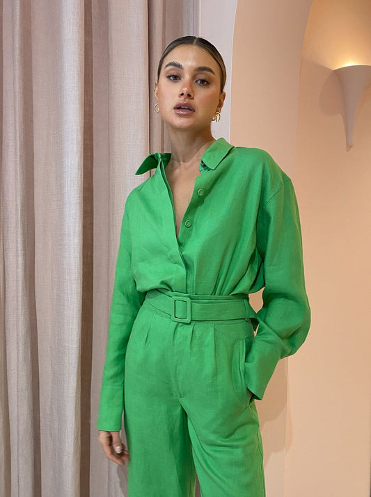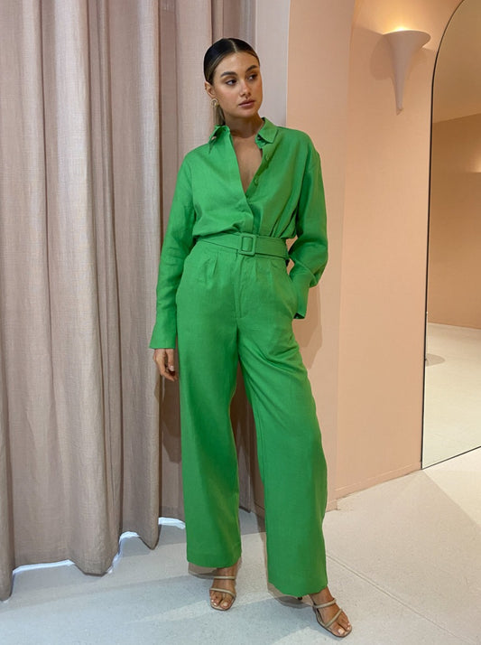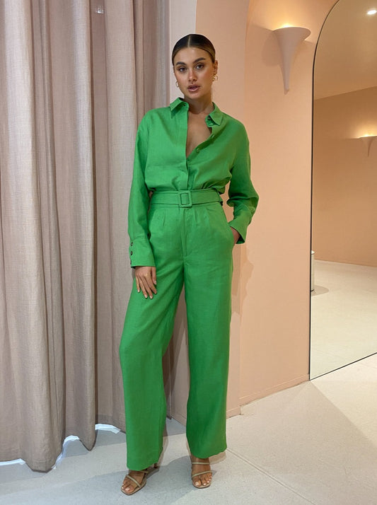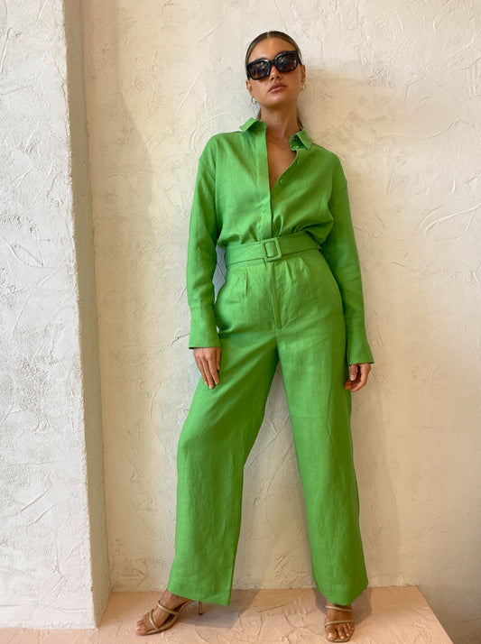 Make a statement in the Devina Relaxed Pant styled with the matching Kate Ford Devina Oversized Shirt in Moss, Alias Mae Lilian Heel in Natural, Porter Harp Earrings in Gold and Vieux Chartreux in Olive Grove.