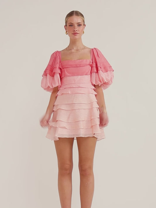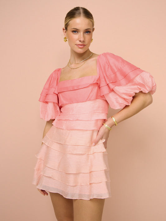 Crafted from a luxurious ombre pink layered fabrication, this mini dress features a square neckline and sweet puff sleeves.