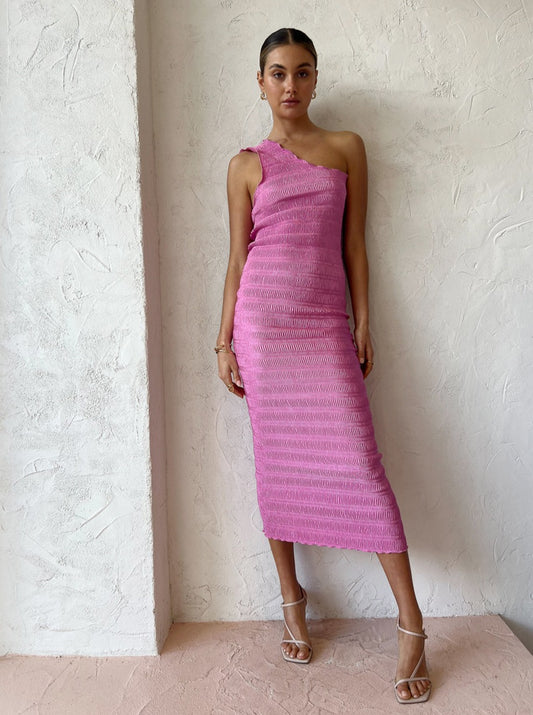 Crafted from L'IDÉE's signature ribbed pleating, this one shoulder midi dress highlights the female female form with a figure hugging silhouette, gentle midi hem and split.