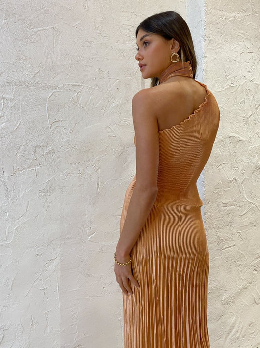 The bronzed summer glow of the elegant Soiree 90s Gown in Tuscany by L'IDÉE will enrich your special Coco moments with glamour.