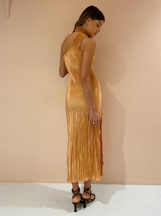 Designed to flatter and grace the femme form, this midi dress features signature L'IDEE ribbed pleating through the torso which softens into a relaxed whimsical silhouette with a gentle fluted hem.