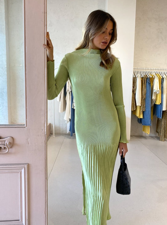 Pleated perfection. The Soiree Open Back Long Sleeve Dress in Pale Green by L'IDEE WOMAN was made for celebrations.