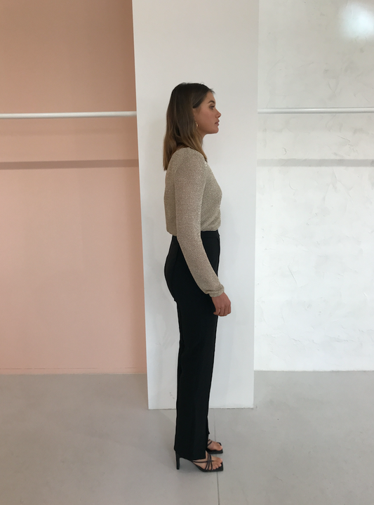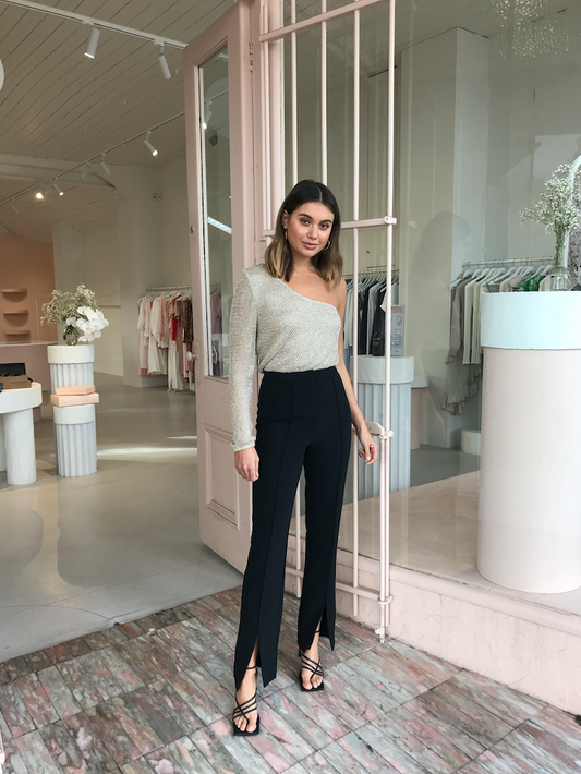 Debuting in their 'Sansevero' editorial look book, the Luhmann Febbre Knit Top features an asymmetric, one-shoulder design, cropped with a slouched-fit. Double folded, rich gold lurex fabric, for extra coverage. A high quality self face stitching technique has been utilised on both the neckline and hem, to ensure a seamless appearance. Elasticised hemming on both arm cuff and hem, enables you to enhance the cropped design if desired. Fabric folds over its self, for a loose fitted, effortless appearance.