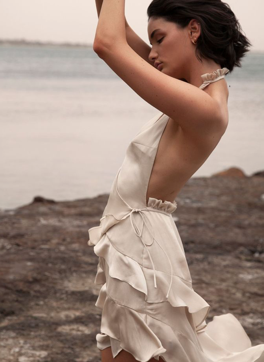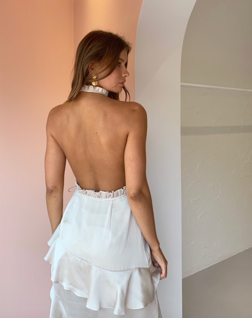 features a halter-neck cut with a sultry open back design. The petite ruffle trim, on both the nape of the neck and waistline, gives the garment a timeless elegance.