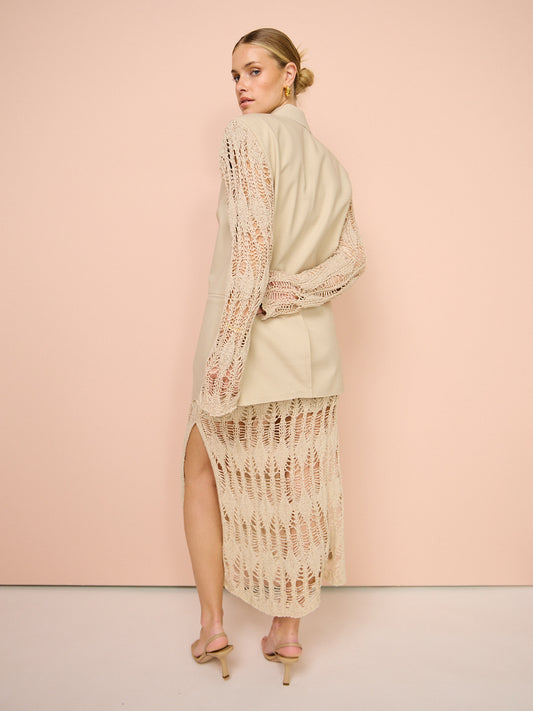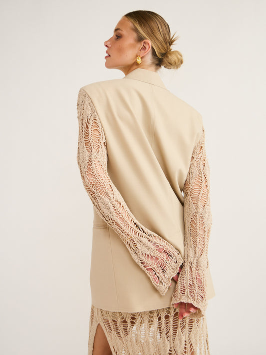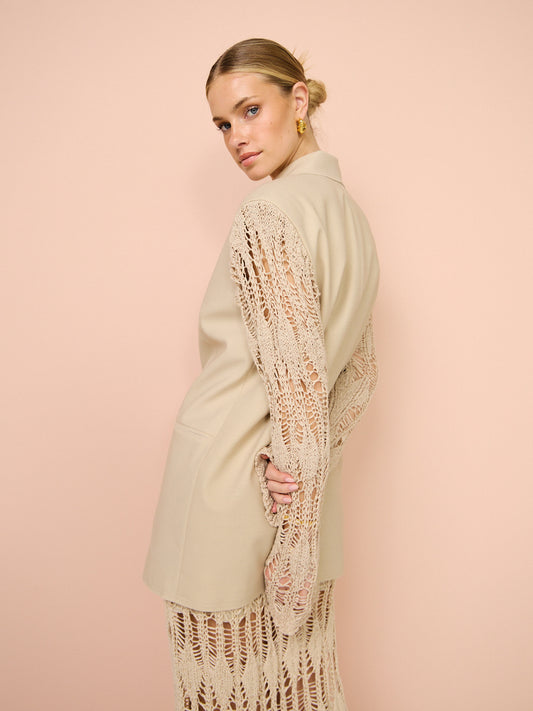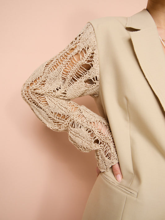 This chic blazer blends off-duty style with coastal appeal. It's expertly crafted with crochet sleeves, raw edges, welt pockets and a relaxed fit that will invite endless compliments.