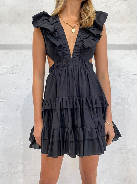 Delicately crafted using a soft and breathable cotton silk blend, this statement mini silhouette features a plunging v neckline with an open back and adjustable ruffle detailed shoulder straps that tie in a delicate bow behind the neck.