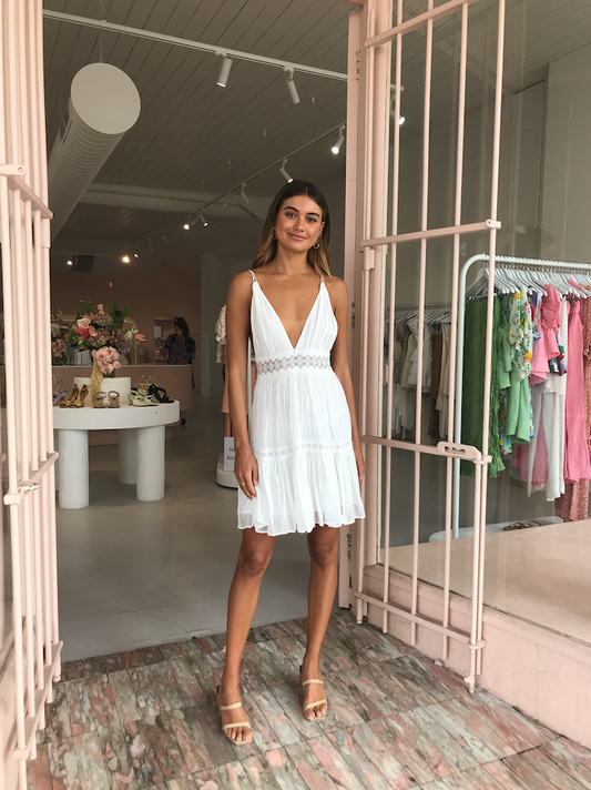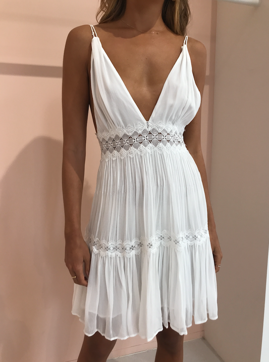 Mini dress featuring a deep V- neck and lace inserts in the skirt. Fitted with adjustable double spaghetti straps, an open back, and center back zipper. Pair with heels for a party look.