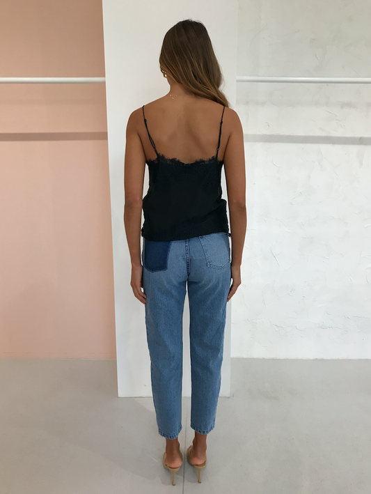 A silk cami with lace detailing at neckline and hem. Designed with v-neckline and adjustable spaghetti straps.