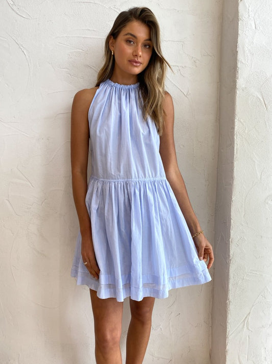 Crafted from a lightweight Cotton Silk blend fabrication, this mini dress features a high scrunched round neckline, drop waistline and horizontal pleating at the hemline.