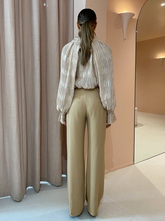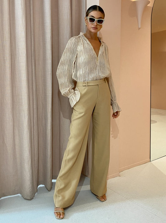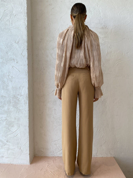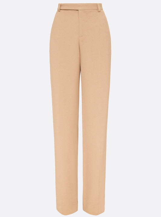 Crafted from a sleek Viscose blend in a tonal Camel hue. These pants are a signature straight leg silhouette designed to flatter sitting high on the waist and featuring an extended waistband with belt loops.