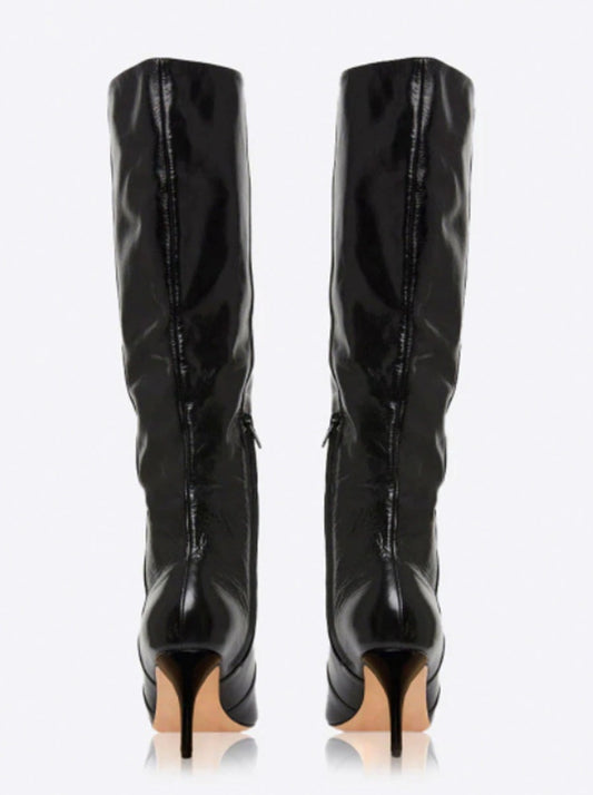 These statement boots are crafted from a demi-matte Leather and feature an oval shaped heel, asymmetrical panel detailing and a concealed inner calf zip.