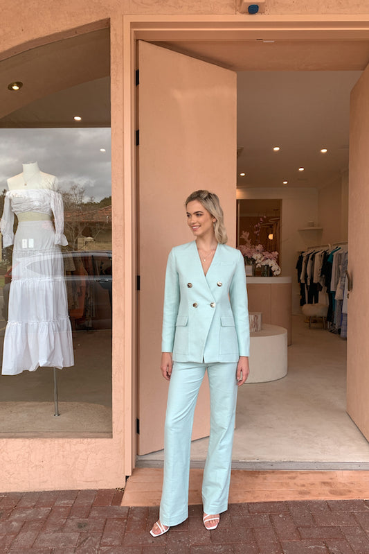 Layer yours over the coordinating Mint Alabaster Pant to continue the power-dressed look.