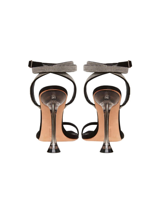 Crafted from a suede leather and ball chain detailing, these high heels feature a singular strap, concave heel for ease of wear and wrap around the ankle twice.