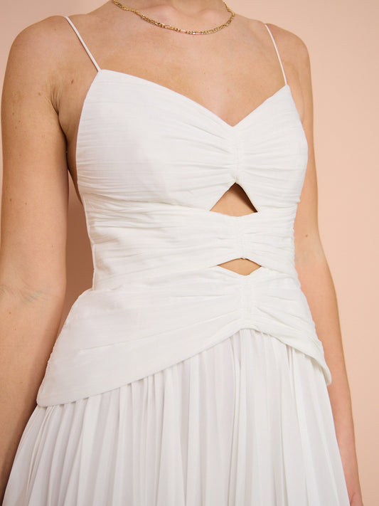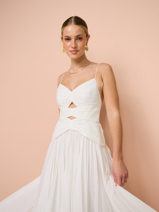 This maxi dress features a sweetheart neckline and soft volume through the skirt, with flattering gathering and cut outs at the waist for an elegant look.