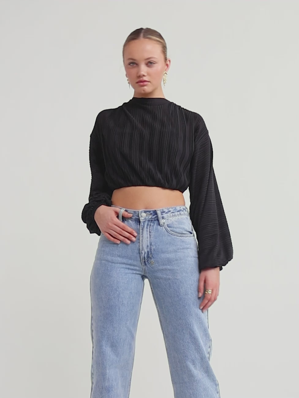 Crafted from a soft touch plisse fabrication, this top features a cropped fit, high neckline and full length sleeves with elasticated cuffs and waistband.