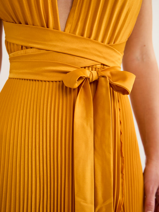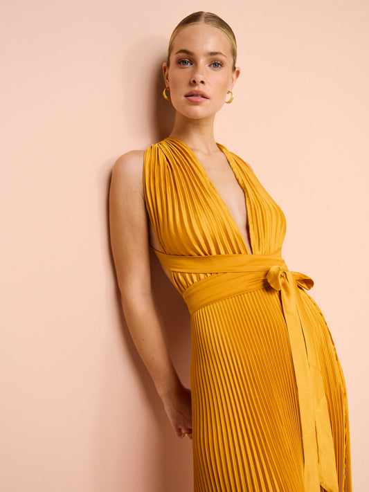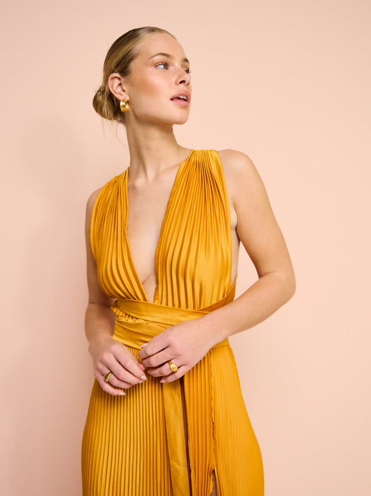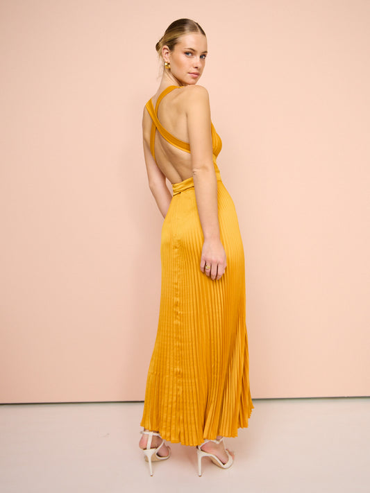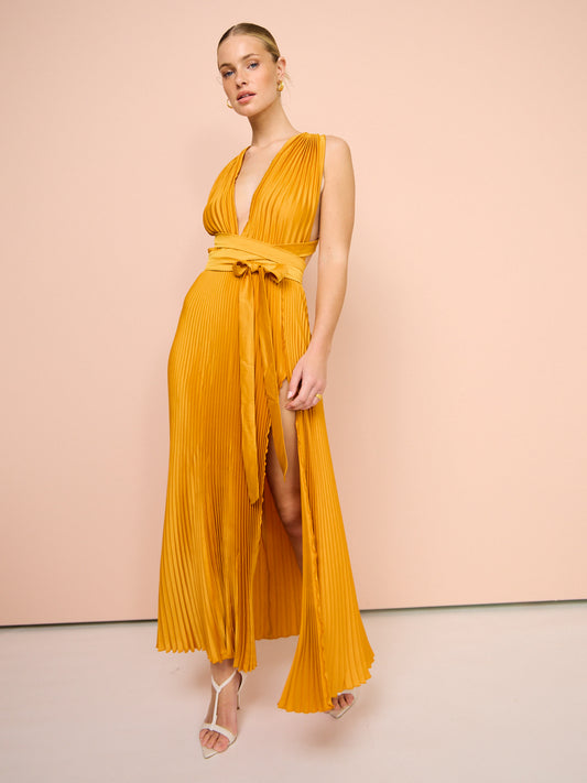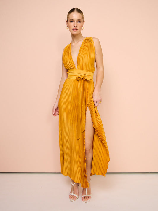 This statement maxi dress features a voluminous skirt with a dramatic hemline split, signature pleated fabrication, and a plunging neckline that will be sure to turn heads.