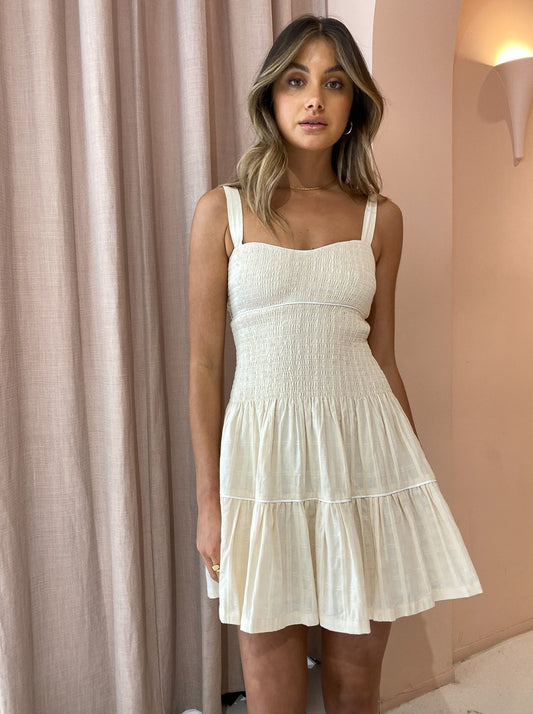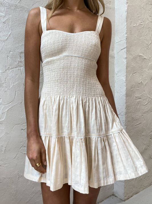 Celebrated for its relaxed tiered skirt with gentle gathers, you'll be twirling day to night all summer long in the Sofia Strappy Mini Dress in Creme.