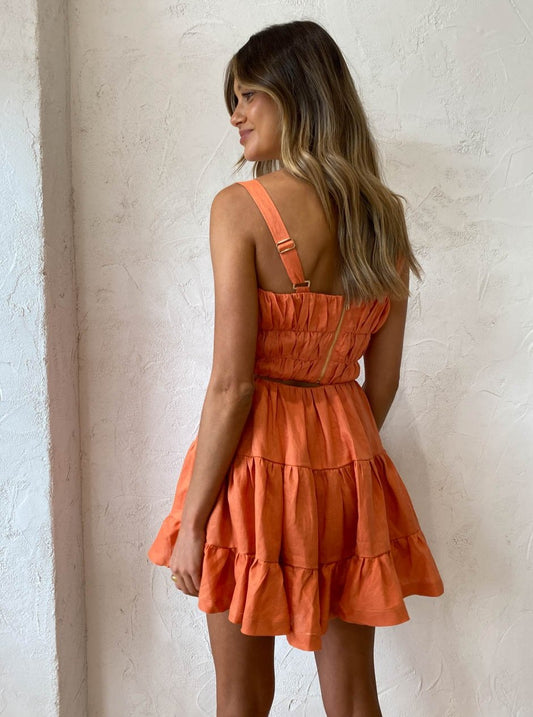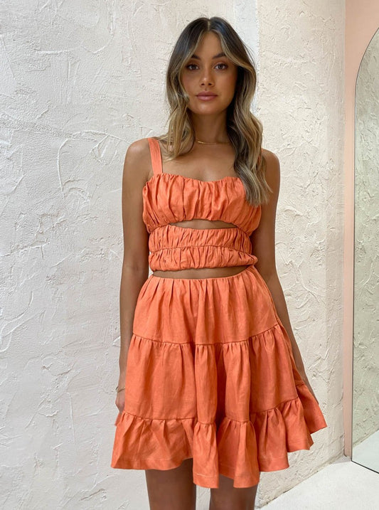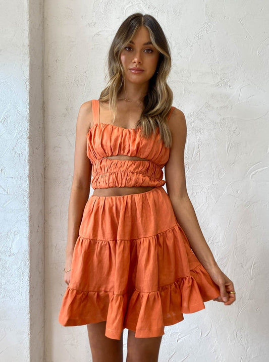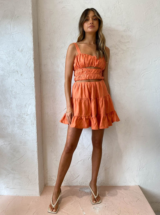 Coco Styling Tip: For your next birthday celebration and sunset drinks, complete this sweet ensemble with the Mon Renn Bailey Crop in Papaya, Camilla and Marc Bell Mid Heel Sandal in Ecru, Porter Wave Croissant Ring in Gold and Tube Bangle 3mm in Gold.