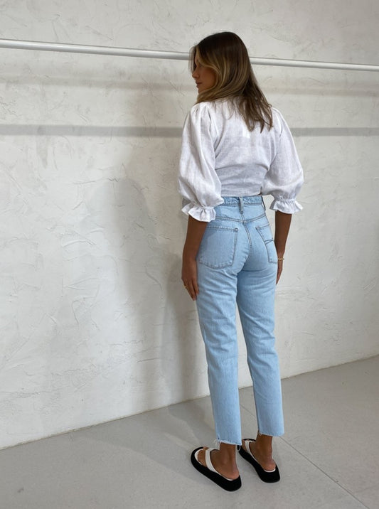 Sitting high on the waist, and showcasing a slim leg with a tapered ankle and raw hem.