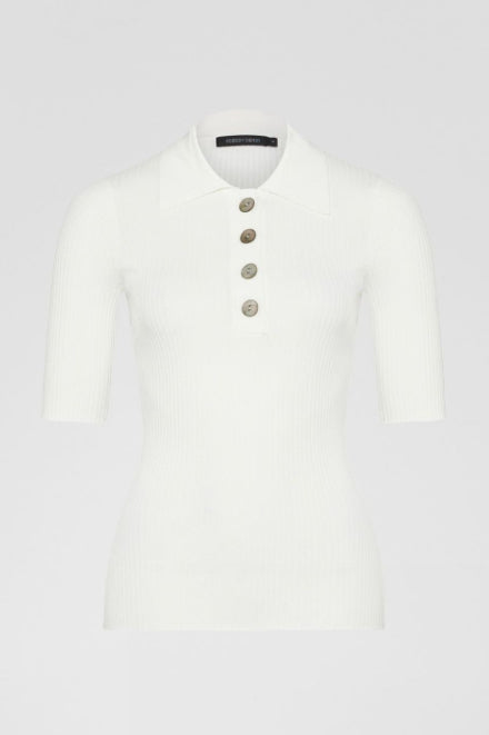 Chelsea Polo Ivory is a Fitted Knit. Crafted from a Viscose, Nylon blend this fully fashioned Knit features Shell buttons which catch the light individually creating a unique neutral colour palette. Wear buttoned up worn or undone, worn alone with a skirt or high rise denim or layer under sweaters.