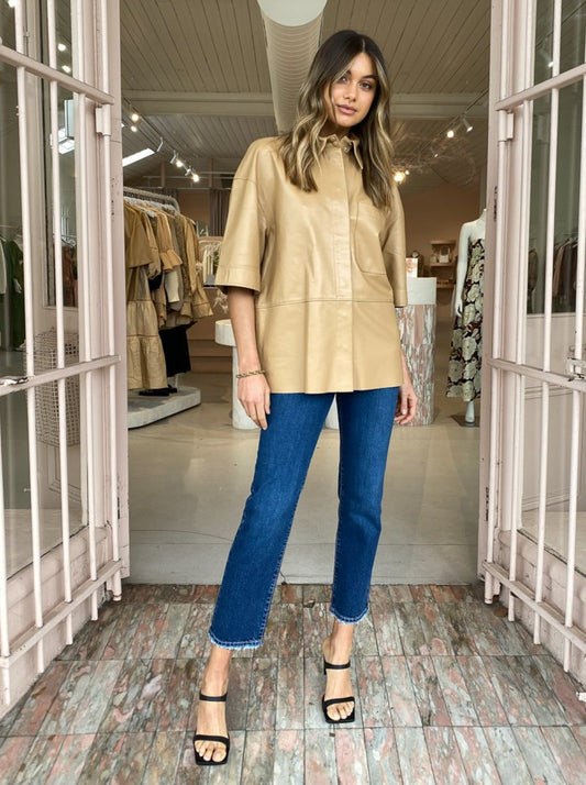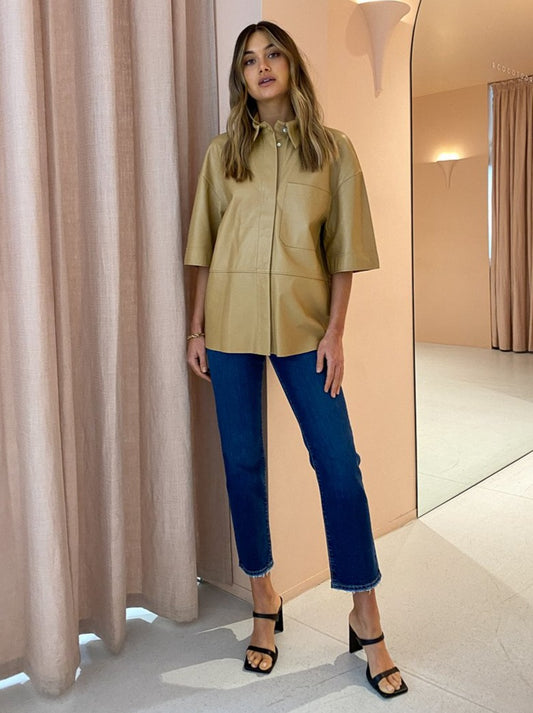 Style with the Camilla and Marc Montaro Leather Shirt in Tan, the Alias Mae Cassie Heel in Black and the Porter Heirloom Wave Bracelet in Gold