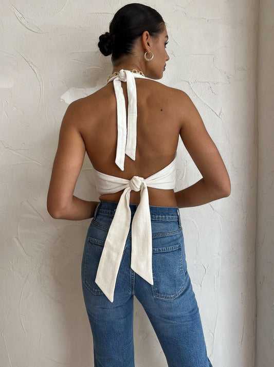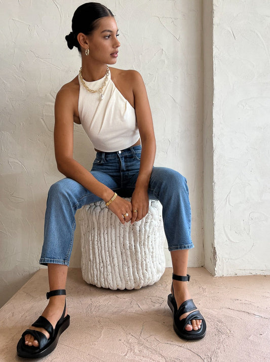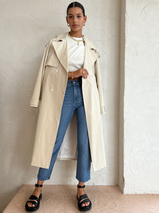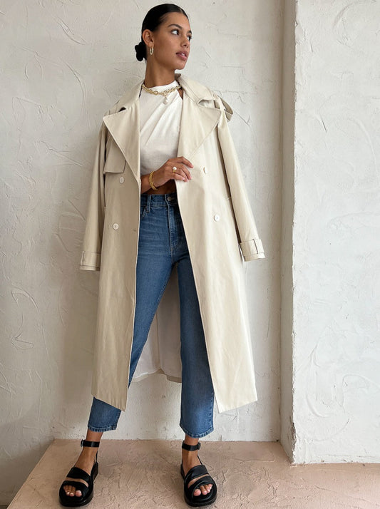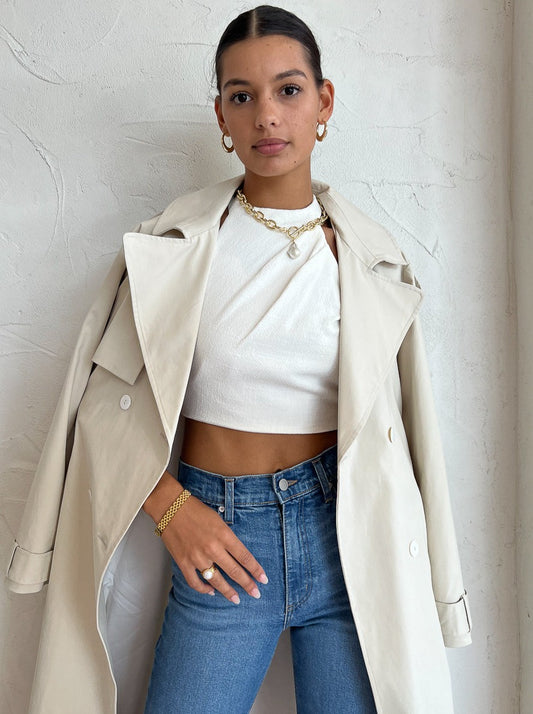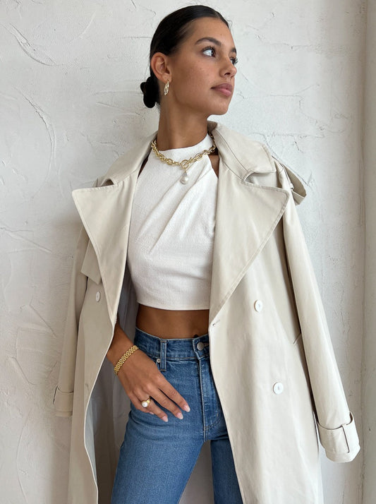 Complete the look with the Sovere Drift Knit Tank in Chalk, Viktoria & Woods President Trench in Bone, Reliquia Hernan Necklace in Gold/Pearl, Reliquia Coralia Hoops in Gold, Porter Baby Link 2.0 Bracelet in Gold, Porter Pond Ring in Gold, and the Camilla and Marc Twister Flat Sandal in Black