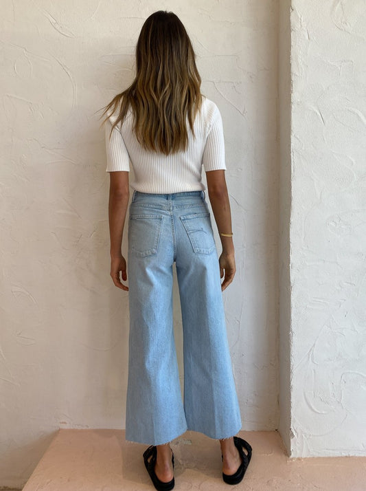 Crafted from a stretch denim, the Milla is cut to fit slim through the hips and thigh to accentuate the femme form and is designed for comfort and to be worn with ease. Featuring a wide leg silhouette which is cropped at the ankle and finished raw.