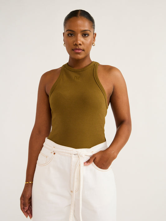 Featuring a racerback cut, wide rib bind at neck, and monogram embroidery, this top fits snug against the body for a contoured look.