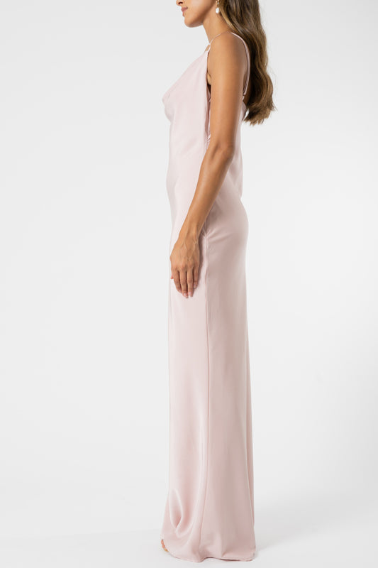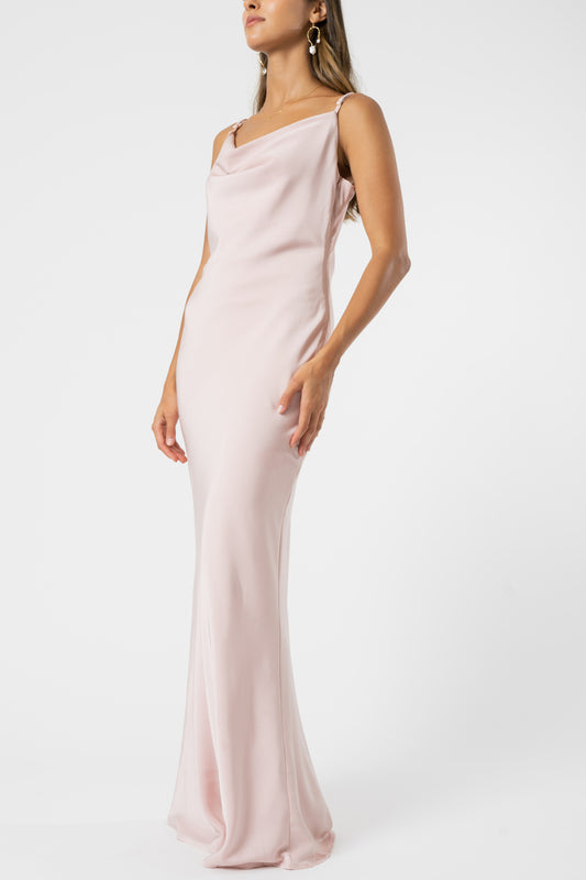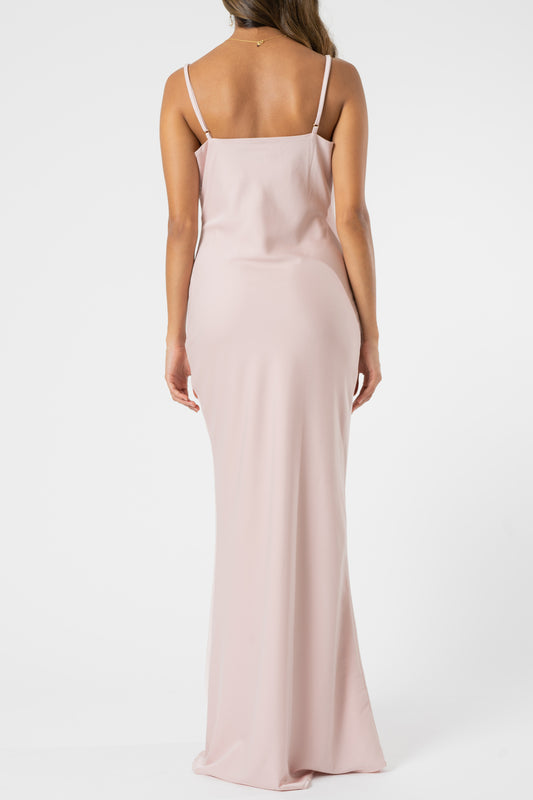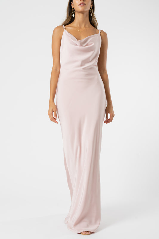 The Olive and Ivy Cowl Maxi is a showstopper, falling elegantly below the ankles and featuring a classic drape neckline with adjustable cami straps.