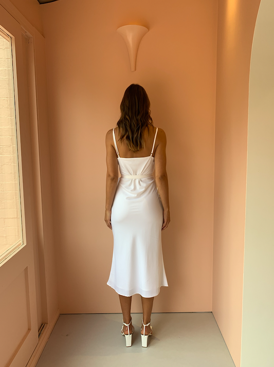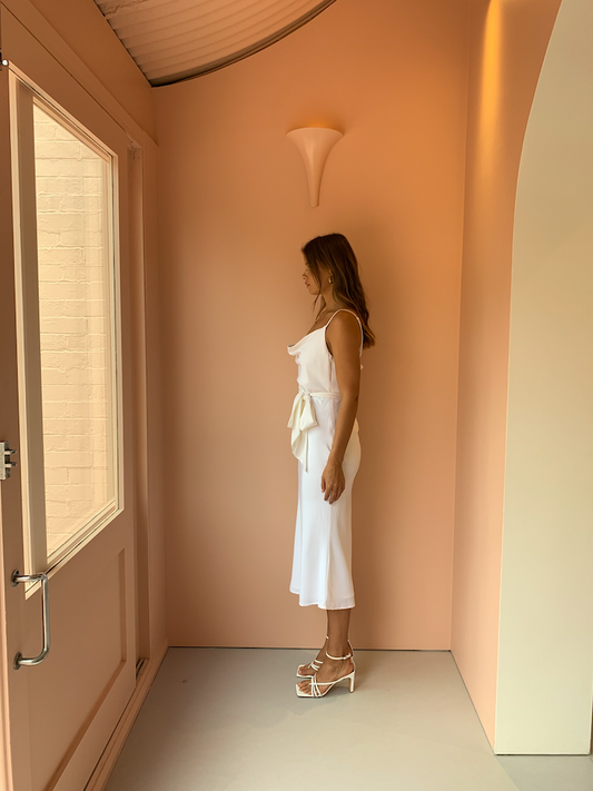 The Olive and Ivy Cowl Midi Dress is cut on the bias for a flattering fit and features adjustable cami straps and elegant cowl neckline.