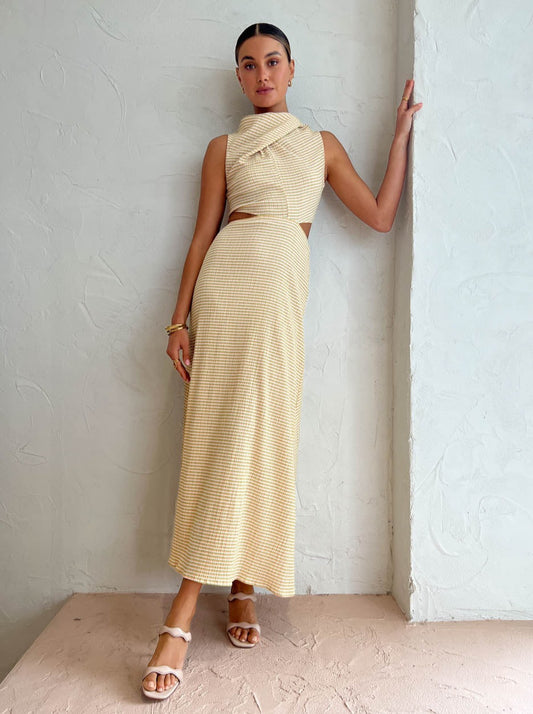 A timeless and elegant maxi length silhouette, this sleeveless maxi dress is cut from a mid-weight fabrication and features a high neckline complimented with structured draping across the chest and gentle asymmetric cut outs at the waist.