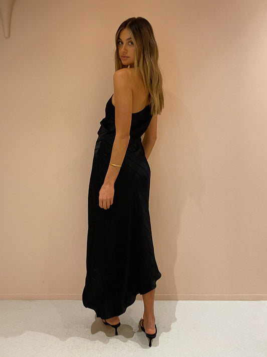 Falling gracefully into an asymmetrical hemline, the Diety Dress contours and accents the femme form perfect for twilight cocktails, wedding celebrations and formal soirees.