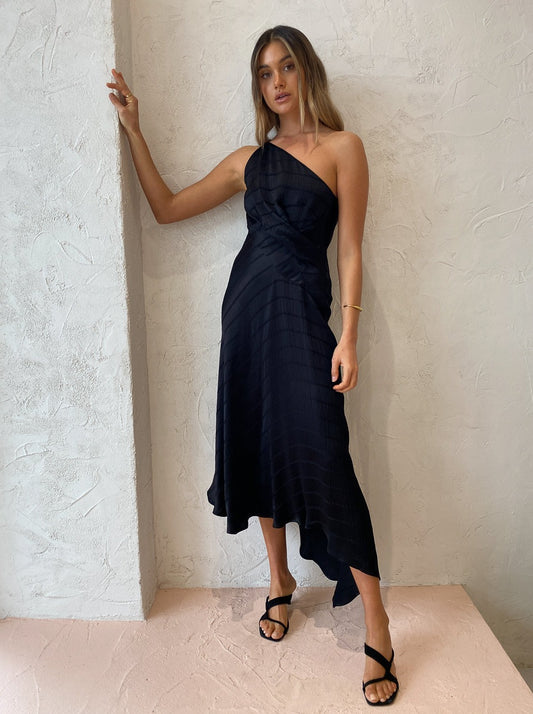 Crafted from a luxurious black fabrication with a slight textured feel, this midi dress features a one shoulder bearing asymmetric neckline that drapes across into the waistline.