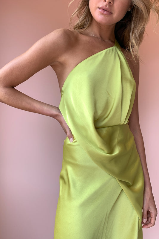 A shoulder-baring asymmetric neckline culminates in flattering drapes and wraps through the waistline for a decidedly feminine finish.