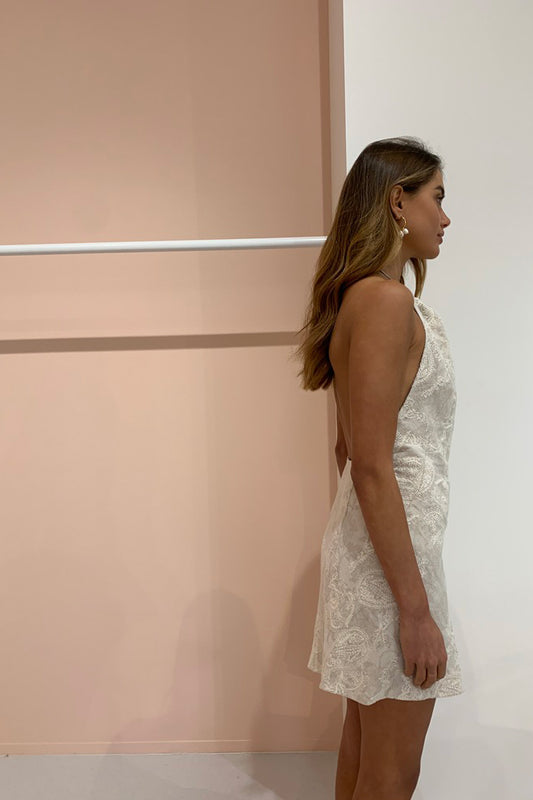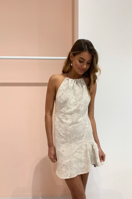 The One Fell Swoop La Californie Mini is crafted from a light and breathable, linen-look woven fabric. Bias cut with a ruched halter neckline and a low-cut back, the elegant mini dress will keep your evening look right on point.