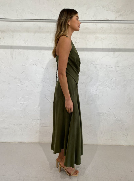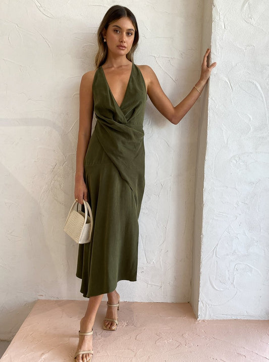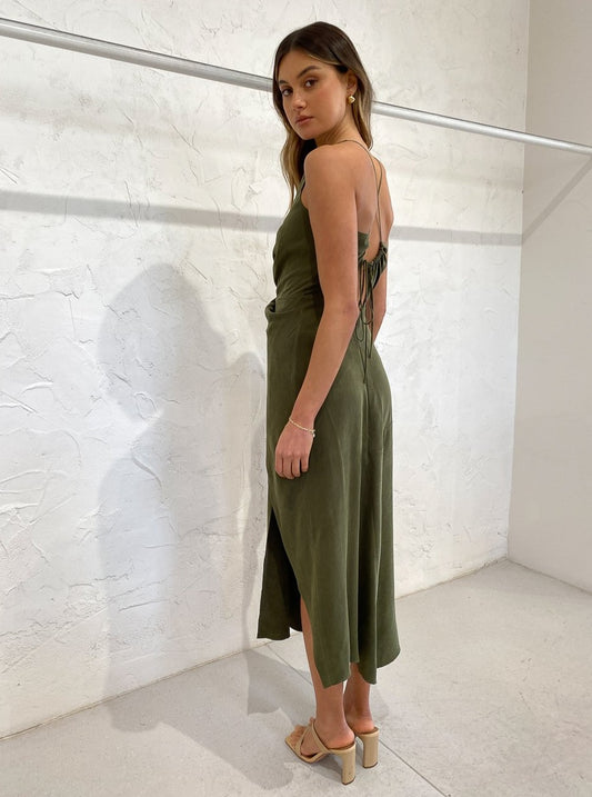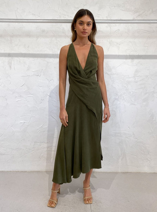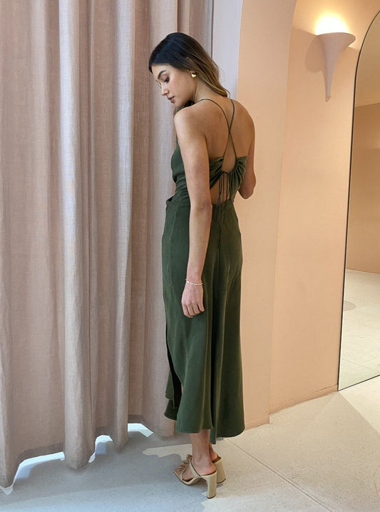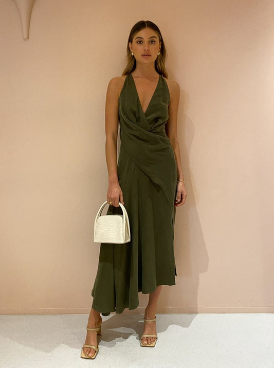 Cut in a midi length silhouette with a gorgeous plunging V-neckline which leads to into flattering drapes and wraps from bust to waistline, the Mudita also features an unexpected shoestring cross back detail and side seam split.