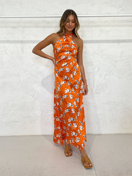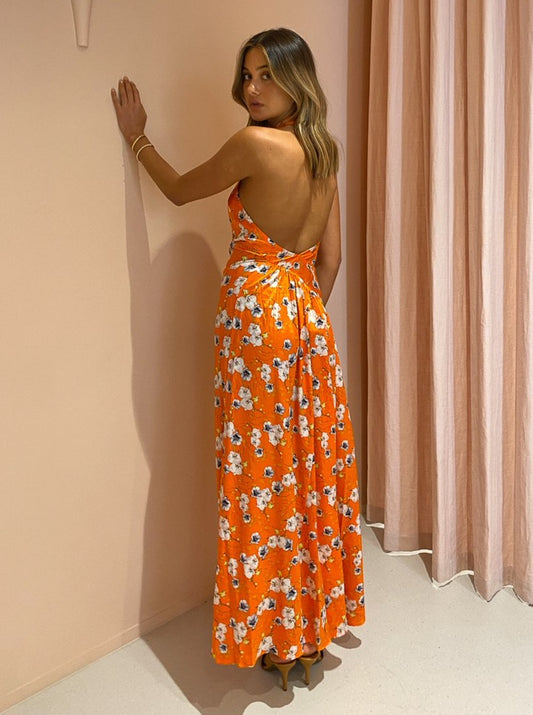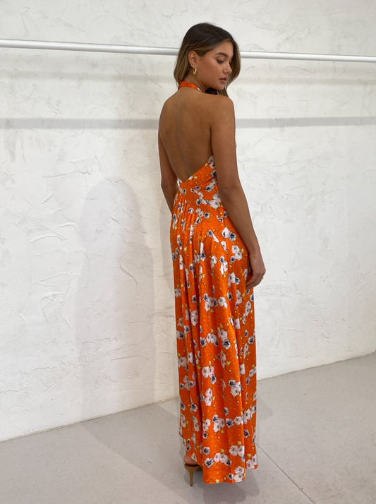 This vibrant silk maxi dress sits effortlessly on the body and showcases a halter neckline with an open back.