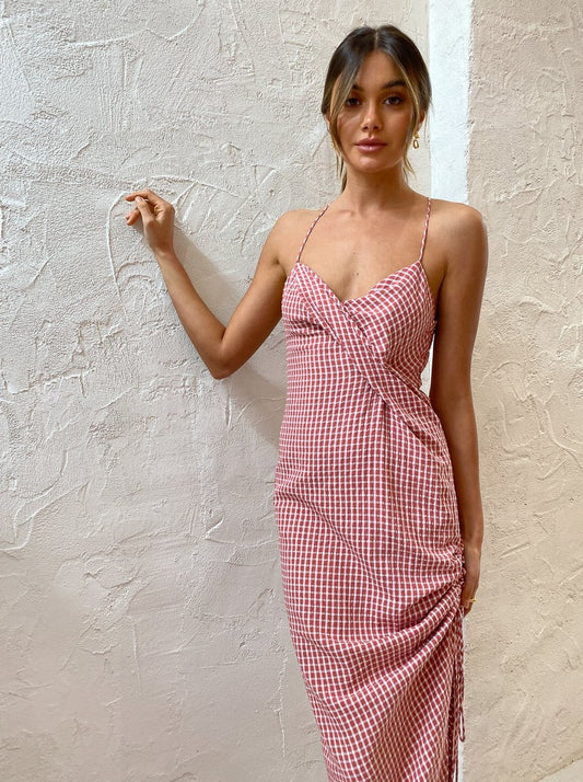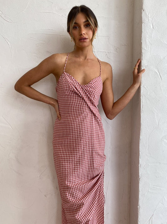 Crafted from a playful gingham printed fabrication, the Venus forms and flatters in all the right ways and features shoestring straps that cross into a racer style back and folded draping across the bust which gracefully falls into a full-length skirt.