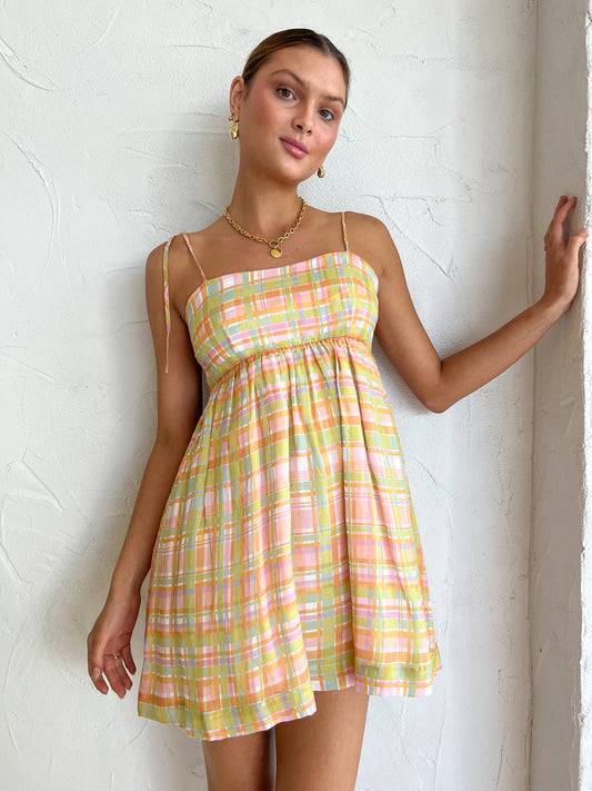 A Summer soireé awaits with the Ownley Maddie Mini Dress in Candy Check.