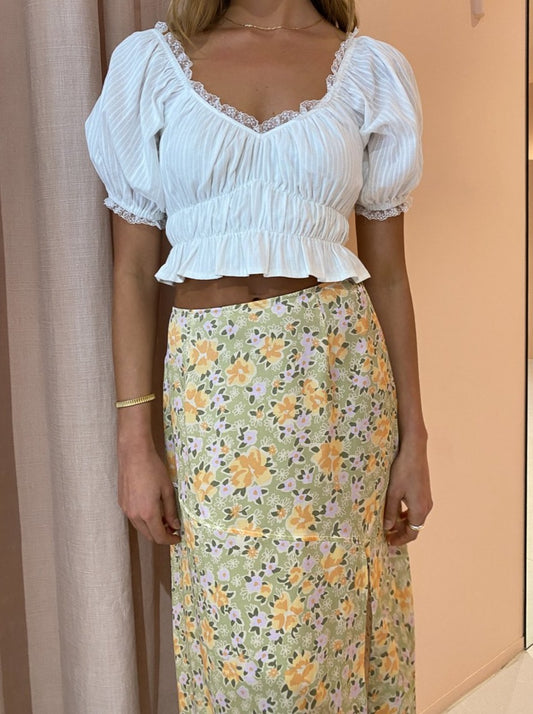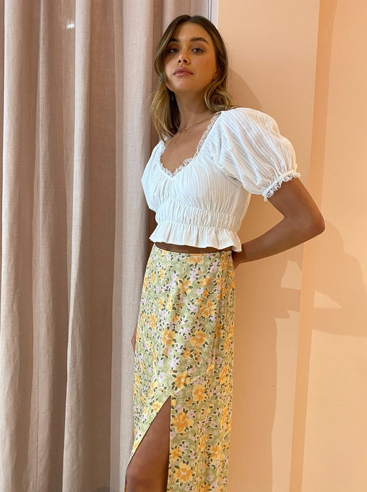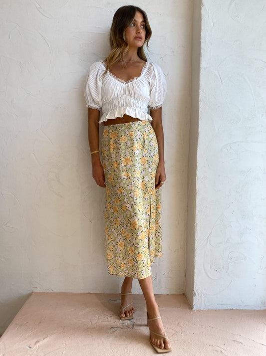 Designed to brighten your day, this midi skirt can be perfectly paired with the Coco Top in Sorbet Floral for sunset cocktails or paired back with a basic tee or tank for an elevated everyday look.