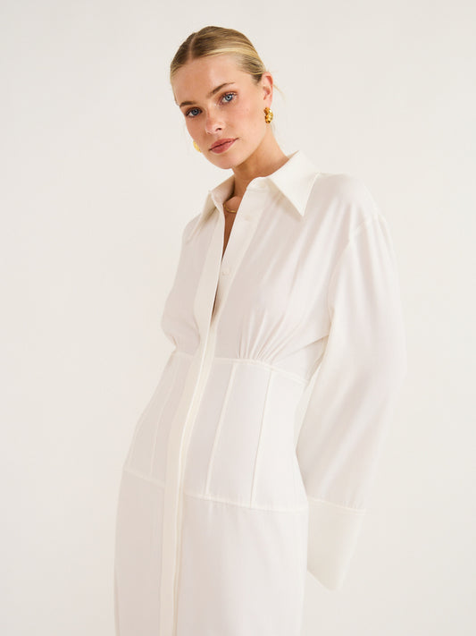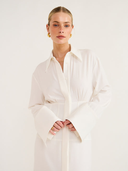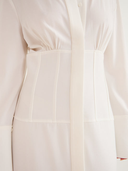 - Corset shirt dress designed to cinch at the waist and fall from the hip