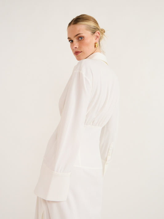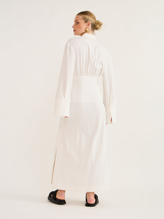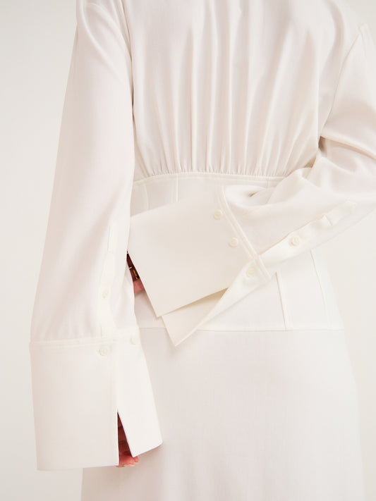 Crafted from a luxurious fabrication, it's designed with a corset-style shirt to cinch in the waist, while the subtle A-line skirt falls from the hip to the midi length. Imbued with chic details like a concealed placket, dropped shoulders with long sleeves and wide cuffs, and a side split for ease of wear, this piece is perfect for special occasions.