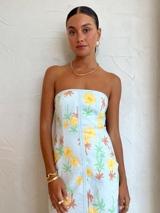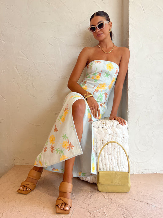 Delicately crafted in a lightweight linen fabrication with palm inspired abstract motifs, this strapless midi dress features angular front pockets and an invisible back zip.