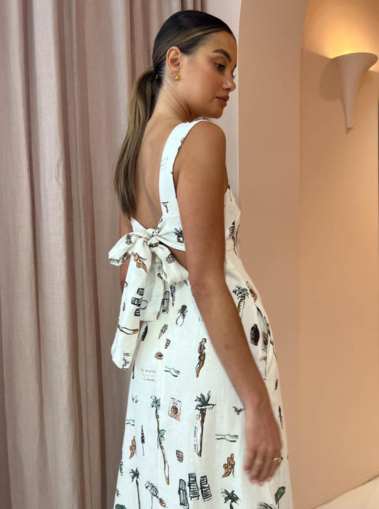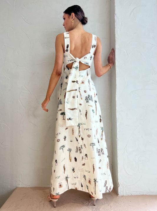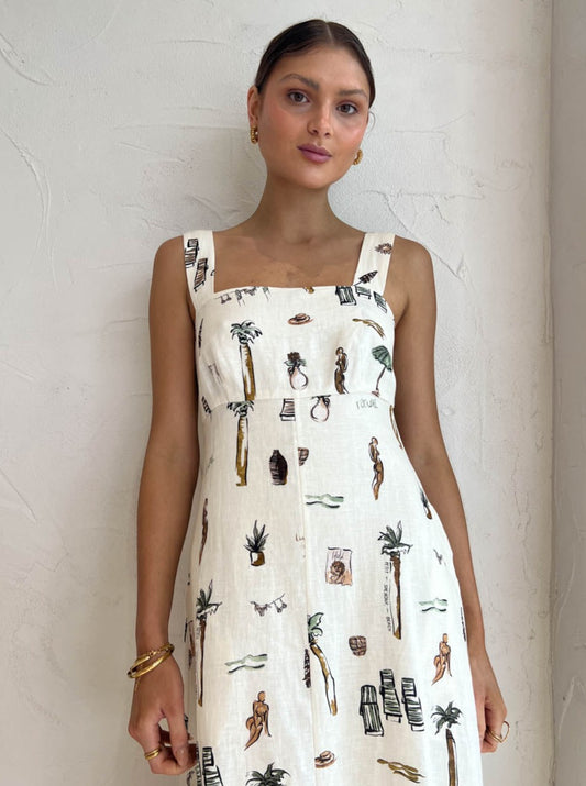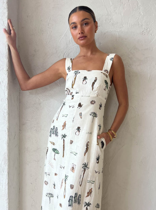 ROAME is providing endless wanderlust for travel and exploration with the Kaia Dress in Roame Vacances Print.
