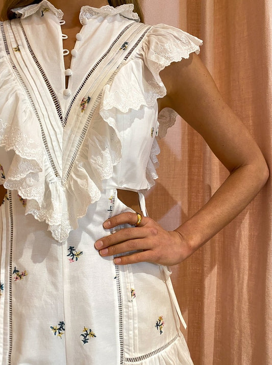 - Embroidered scallop ruffle trim at neck, bodice and hemline